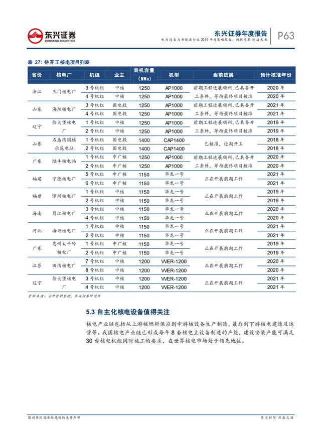 在核電領(lǐng)域,總投資423億元的國電投CAP1400核電示范工程項(xiàng)目已實(shí)現(xiàn)核準(zhǔn),將于近期開工。2019年自主三代核電技術(shù)有望取得突破,中核漳州1、2號和廣核惠州1、2號共4臺“華龍一號”機(jī)組核準(zhǔn)預(yù)期不斷提升。