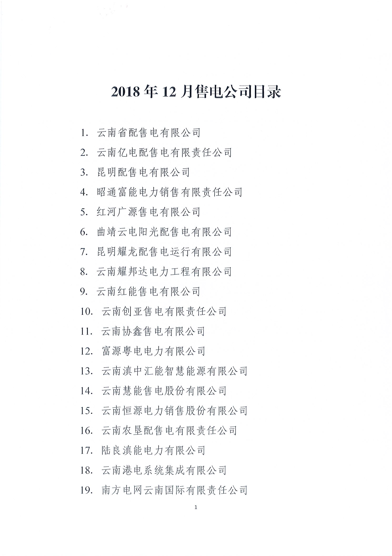 云南發(fā)布了《關(guān)于公布2018年12月售電公司目錄的通知》