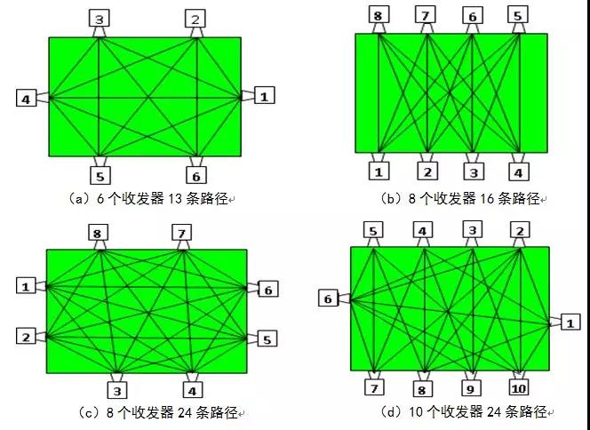 對于溫度分辨率要求不高的測溫環(huán)境,一條或者兩條相互獨立路徑上的測溫單元就足夠了。對于火電廠鍋爐來說,要實現(xiàn)爐膛二維溫度場的監(jiān)測,必須要在鍋爐的橫截面圓周上布置大量的聲波發(fā)聲和接收系統(tǒng),獲得大量的路徑溫度信息,通過重建算法建立這個平面的二維溫度場。圖2列舉出了不同布置的聲波收發(fā)系統(tǒng)形成的多路徑測量圖。