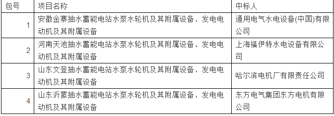 中標(biāo)結(jié)果表明,國家電網(wǎng)正在建設(shè)的安徽金寨抽水蓄能電站、河南天池抽水蓄能電站、山東文登抽水蓄能電站、山東沂蒙抽水蓄能電站4大抽水蓄能電站的水泵水輪機及其附屬設(shè)備、發(fā)電電動機及其附屬設(shè)備中標(biāo)人為4家不同的供應(yīng)商。