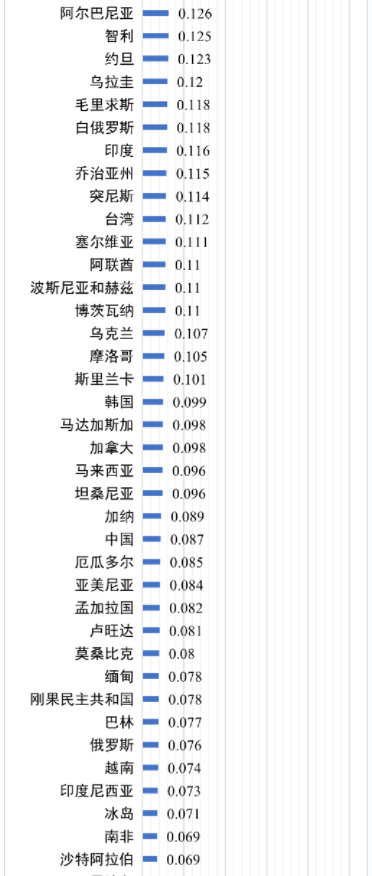 圖2 133個(gè)經(jīng)濟(jì)體工商業(yè)用戶平均電價(jià)(100萬(wàn)千瓦時(shí)/年用電等級(jí),含稅終端電價(jià),2022年四季度,美元/千瓦時(shí))