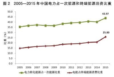 當前我國與發(fā)達國家電能在終端能源消費中的比重持平,且我國還略高于英國等發(fā)達國家。這種現(xiàn)象使一些專家認為,我國電能占終端能源比重不會再提高。筆者認為,發(fā)達國家天然氣在終端能源消費中的比重約為25%,而我國在7%左右,我國計劃在2020年力爭達到10%,2030年達到15%左右。制約天然氣發(fā)展的主要因素是資源、價格以及相對于可再生能源碳排放仍然較高的特性。要提高我國終端能源消費的清潔化,需要同步提高可再生能源發(fā)電比重及電能在終端能源消費中的比重(見圖2)。