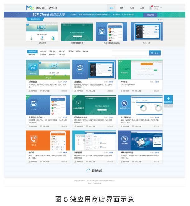 微應(yīng)用運(yùn)營(yíng)中心主要負(fù)責(zé)微應(yīng)用產(chǎn)品的運(yùn)營(yíng)相關(guān)工作,主要包括微應(yīng)用商店、API 商店、微應(yīng)用生態(tài)管理3 部分。微應(yīng)用商店界面示意如圖5 所示。